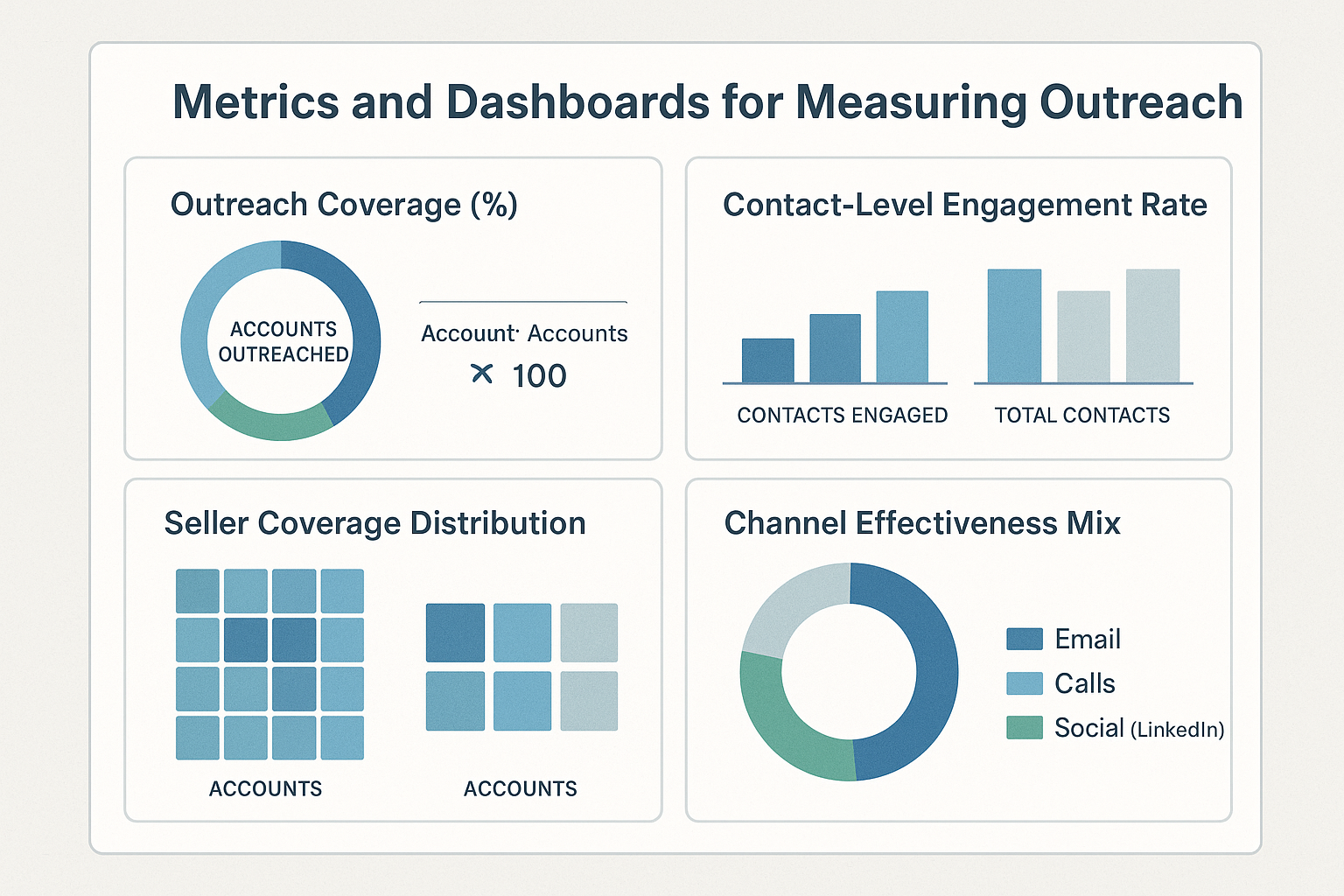 Dashboards combining these metrics can offer instant visibility into where your outreach program stands today—allowing leaders to set clear goals, balance workloads across teams, and identify market segments that are under-engaged or overlooked.